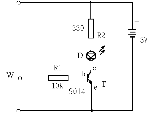 电阻R1基极偏置用,电阻R2有限流作用,也是三极管集电极的负载电阻。发光二极管D指示作用,三极管T开关作用,电池E供电。